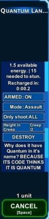 The Lancer is an assault unit which can directly assault enemy units, towers, and some projectiles like Missiles from the Rocket Launcher. It also has a stun mode which has a lot more range and will stun the target unit as well as nearby units while also depleting their ammo by 80%. Additionally, Vanilla Shields are destroyed by this Stun Pulse, including shields not directly hit by the Stun Pulse, making the Lancer extremely effective in destroying a shield wall (depending on how close each Shield is to each other).
