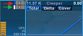 The blue and white bars (pointed at by the red and green arrows respectively) show overview information for the terrain the cursor is pointed at. The relative width of the colored portion of the bar is the active cycle time, the number (6, in this instance) is the rate at which the terrain will increase the specified type of creeper.