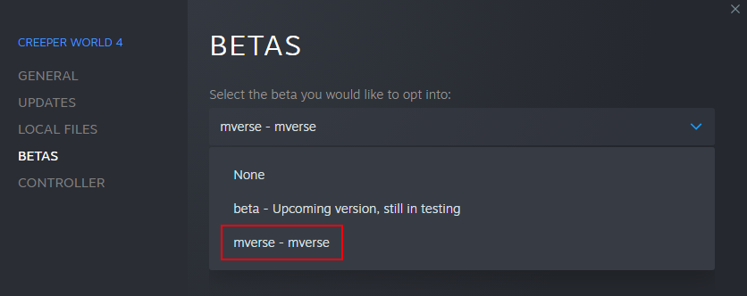 Go into your Steam library, right click on Creeper World 4, select Properties. Then head into the Betas tab, and switch to the `mverse` beta as shown below: